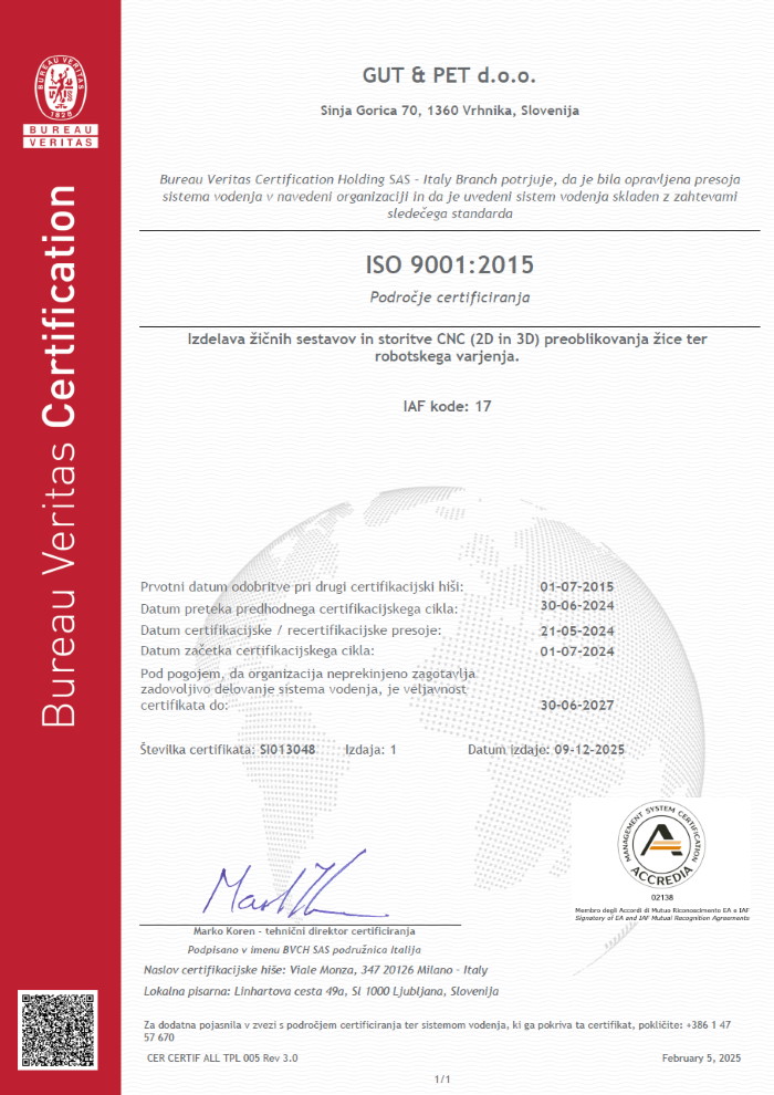 V podjetju GUT & PET d.o.o. smo dne 9. 12. 2025 uspešno podaljšali certifikat ISO 9001:2015, ki zajema izdelavo žičnih sestavov ter storitve CNC (2D in 3D) preoblikovanja žice in robotskega varjenja.