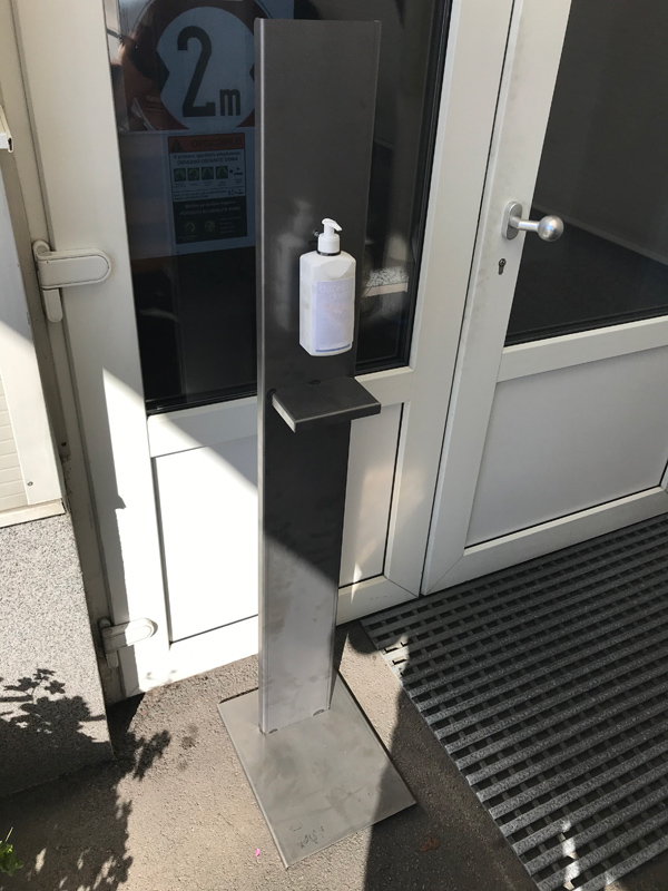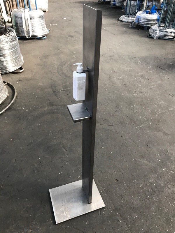 Izdelamo lahko različna samostoječa kovinska stojal za razkužila in nosilce razkužil za pritrditev na steno. Na sliki je primer samostoječega stojala, katerega glavne značilnosti so prostor nad razkužilom, kjer je možno namestiti napis/nalepko (opozorila, navodila). Nosilec razkužila prilagodimo embalaži razkužila. Pod razkužilom se nahaja še polička, za preprečevanje morebitnega kapljanja razkužila po tleh. Izdelek lahko dodatno prilagodimo oz. dopolnimo v skladu z vašimi željami.